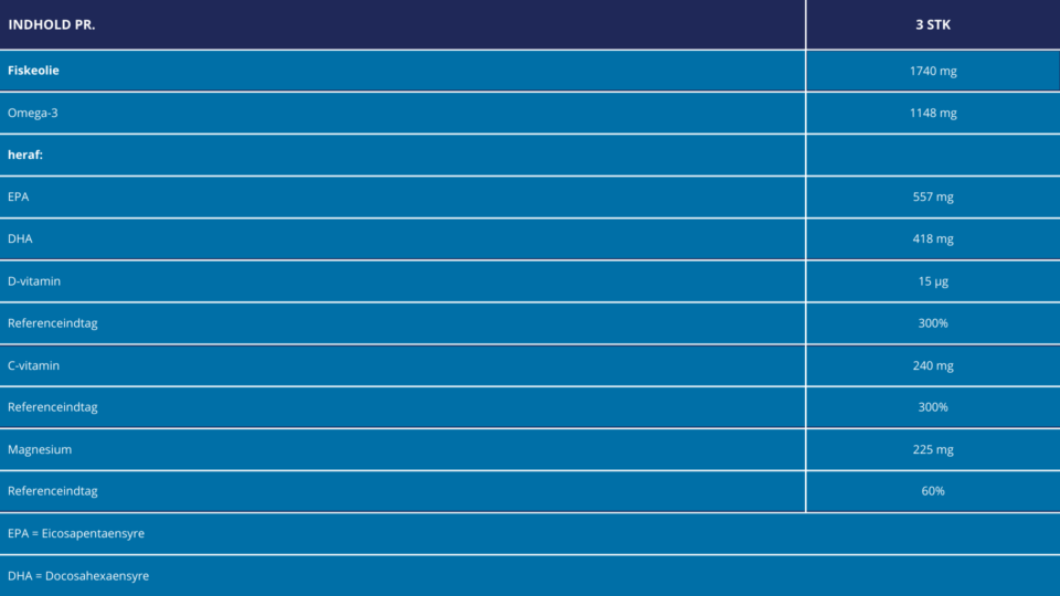 – EPA og DHA hjælper til en normal hjertefunktion. Den gavnlige effekt opnås ved et dagligt indtag på 250 mg EPA og DHA.